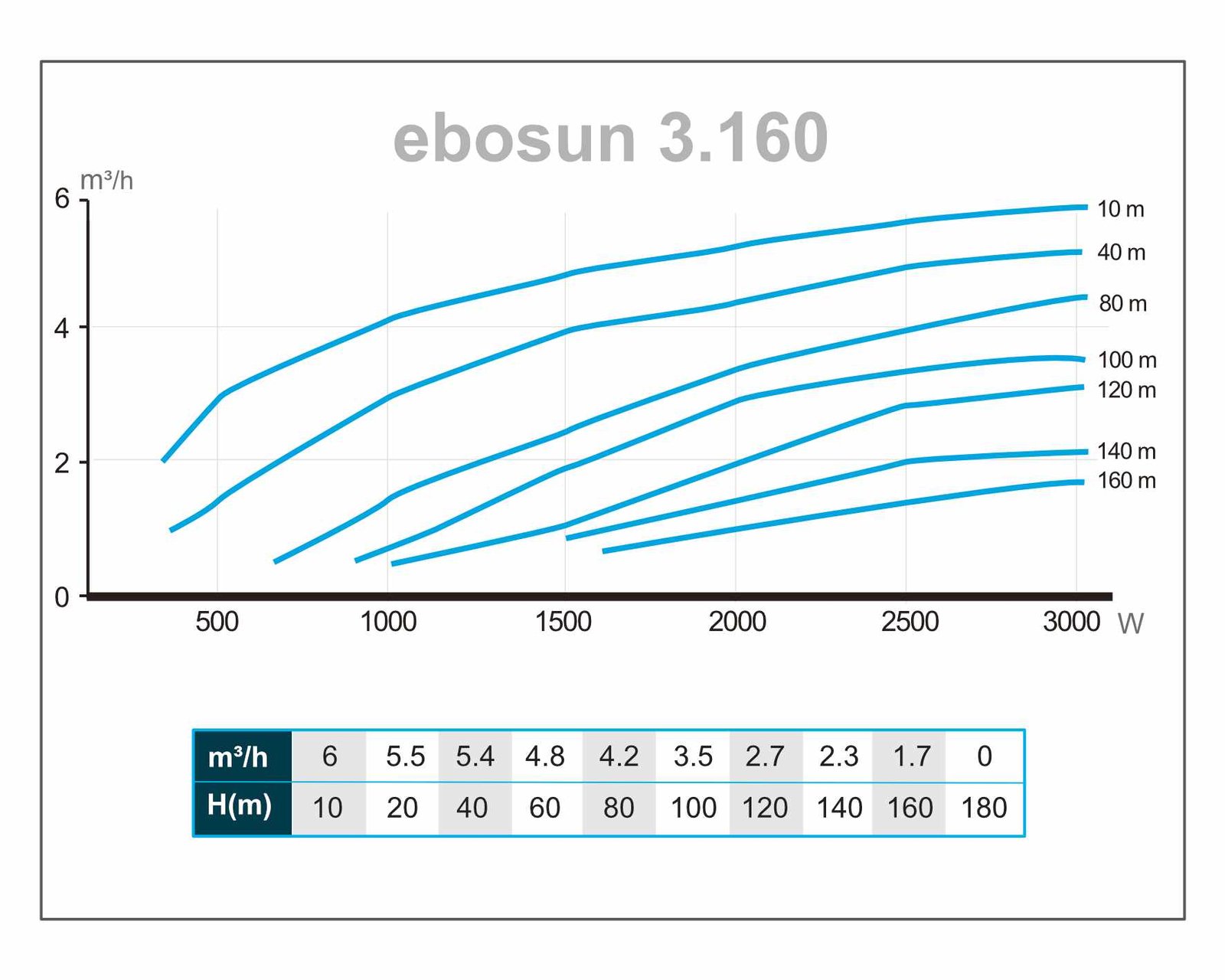1 x Bomba Solar Ebosun 3.160.La bomba sumergible ebosun permite un funcionamiento profesional, diario e ininterrumpido. El modelo Ebosun 3.160 es una bomba centrifuga, que permite un funcionamiento con paneles solares de 60 a 380V DC y también permite un funcionamiento con corriente AC bien sea de red electrica o de generador.La bomba sumergible ebosun también incluyen las siguientes protecciones: Protección contra sobre voltaje y bajo voltaje, Protección contra sobrecarga y Protección contra sobre temperatura.