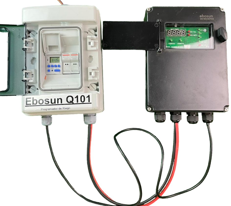 El programador de riego Q101 es la solución perfecta para programar el funcionamiento de tu sistema de bombeo solar.. Programa horas y dias de funcionamiento de tu bomba solar con el Programador Q101, con hasta 28 programas disponibles,  para adaptar el bombeo a tus necesidades de riego y funcionamiento. Compatible con bombas solares Ebosun, Grundfos y Acrosun. Facil de Programar, no precisa baterías ni fuente de alimentación externa.